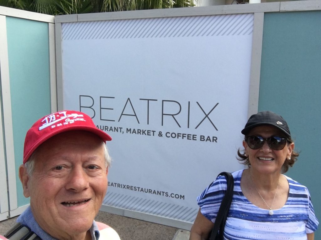 Beatriz Jaramillo Vélez con Alfredo Vanegas Montoya en Beatrix Restaurant, Market & Coffee Bar, Disney Springs, Lake Buena Vista, Florida, USA.