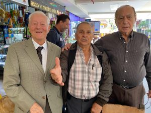 En el Centro Darío Agudelo con León Jaramillo a su izquierda y Alfredo Vanegas a la derecha. Parque Principal de Envigado.